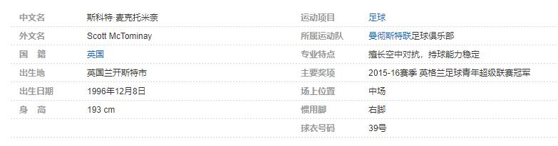 斯科特·麦克托米奈(Scott McTominay),1996年12月8日出生于英格兰兰开夏郡的兰开斯特市,苏格兰足球运动员,场上司职中场,效力于英超的曼彻斯特联足球俱乐部。个人简介: