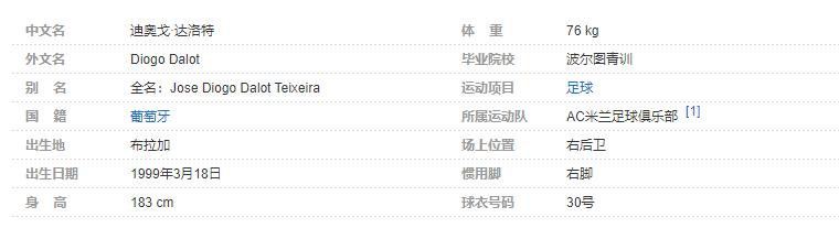 迪奥戈·达洛特(Diogo Dalot,1999年3月18日-- )葡萄牙足球运动员,全名:若泽·迪奥戈·达洛特·特谢拉(Jose Diogo Dalot Teixeira),出生于葡萄牙布拉加,场上司职右后卫,效力于AC米兰足球俱乐部。个人简介: