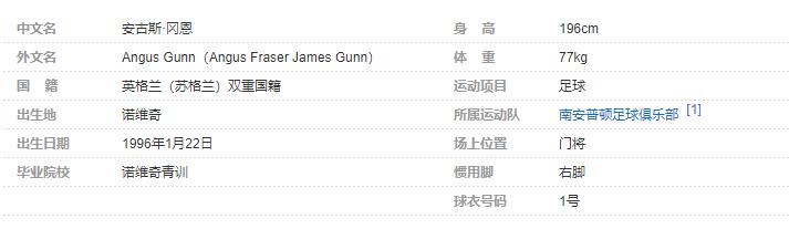 安古斯·冈恩(Angus Gunn),全名:安古斯·弗雷泽·詹姆斯·冈恩(Angus Fraser James Gunn),1996年1月22日出生于英格兰诺维奇,英格兰足球运动员,场上司职门将,现效力于南安普顿足球俱乐部。个人简介: