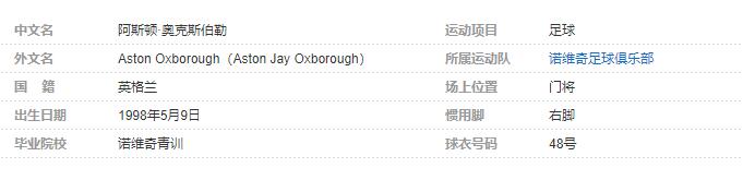 阿斯顿·奥克斯伯勒(Aston Oxborough),全名:阿斯顿·杰伊·奥克斯伯勒(Aston Jay Oxborough),1998年5月9日出生于英格兰,英格兰足球运动员,场上司职门将,现效力于英冠的诺维奇足球俱乐部。个人简介: