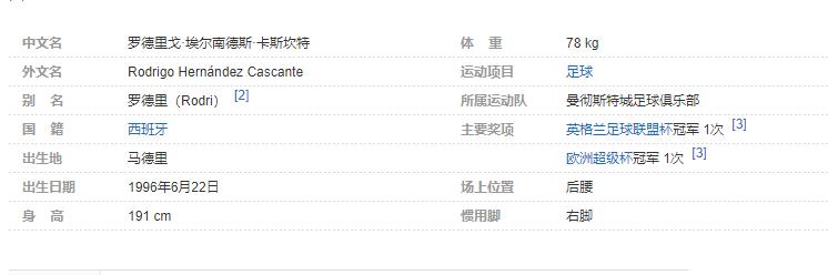 罗德里戈·埃尔南德斯·卡斯坎特(Rodrigo Hernández Cascante),昵称罗德里(Rodri),1996年6月22日出生于西班牙马德里,西班牙足球运动员,场上司职后腰,效力于英格兰足球超级联赛的曼彻斯特城足球俱乐部。个人简介: