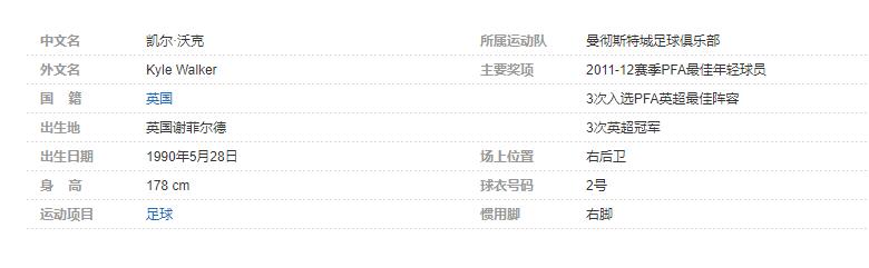凯尔·沃克(Kyle Walker),1990年5月28日出生于英国谢菲尔德,英国(英格兰)职业足球运动员,场上司职右后卫,效力于英超曼彻斯特城足球俱乐部 。个人简介: