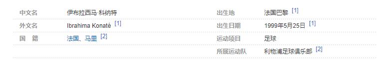 伊布拉西马·科纳特,1999年5月25日出生于法国巴黎,法国职业足球运动员,司职后卫。现效力于英超的利物浦足球俱乐部。个人简介: