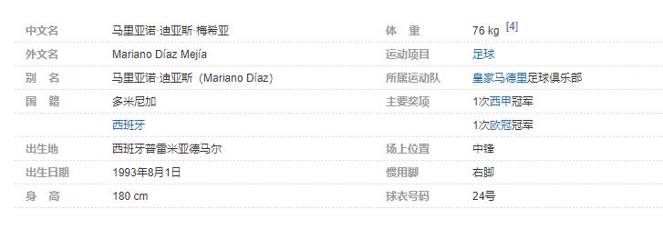 马里亚诺·迪亚斯(Mariano Díaz),全名马里亚诺·迪亚斯·梅希亚(Mariano Díaz Mejía),1993年8月1日出生于西班牙普雷米亚德马尔,拥有多米尼加/西班牙双重国籍,多米尼加职业足球运动员,司职中锋,效力于西班牙足球甲级联赛皇家马德里足球俱乐部。
