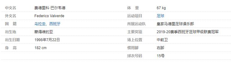 费德里科·巴尔韦德(Federico Valverde),全名费德里科·圣地亚哥·巴尔韦德·迪佩塔(Federico Santiago Valverde Dipetta),1998年7月22日出生于乌拉圭蒙得维的亚,拥有乌拉圭和西班牙双重国籍,场上司职中前卫,效力于西班牙足球甲级联赛的皇家马德里足球俱乐部。个人简介