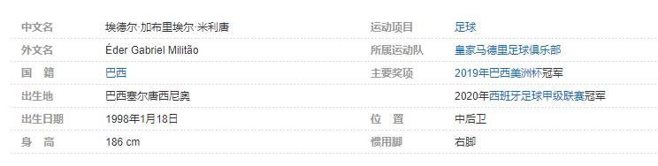 埃德尔·加布里埃尔·米利唐(Éder Gabriel Militão),1998年1月18日出生于巴西塞尔唐西尼奥,巴西职业足球运动员,司职中后卫,现效力于西班牙皇家马德里足球俱乐部。