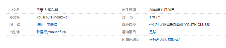 优素法·穆科科(Youssoufa Moukoko),2004年11月20日出生于喀麦隆雅温得(Yaoundé)市,拥有德国和喀麦隆双重国籍,德国足球运动员,司职前锋,现效力于德甲的多特蒙德足球俱乐部。个人简介
