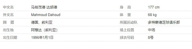 马哈茂德·达胡德(Mahmoud Dahoud),1996年1月1日出生于叙利亚阿穆达,德国足球运动员,场上司职中场,效力于多特蒙德足球俱乐部。个人简介