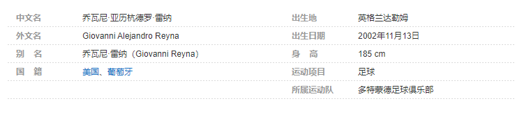乔瓦尼·雷纳(Giovanni Reyna),全名乔瓦尼·亚历杭德罗·雷纳(Giovanni Alejandro Reyna),2002年11月13日出生于英格兰达勒姆,是一名美国职业足球运动员,场上司职中场,现在效力于德国足球甲级联赛的多特蒙德足球俱乐部 。个人简介