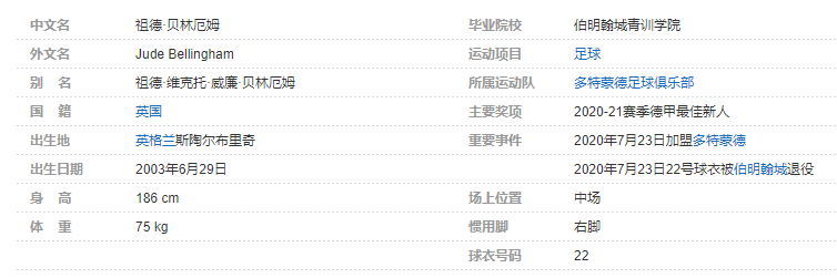 祖德·贝林厄姆(Jude Bellingham),2003年6月29日出生于英格兰斯陶尔布里奇,英格兰足球运动员,场上司职中场,现效力于德国足球甲级联赛的多特蒙德足球俱乐部 。个人简介
