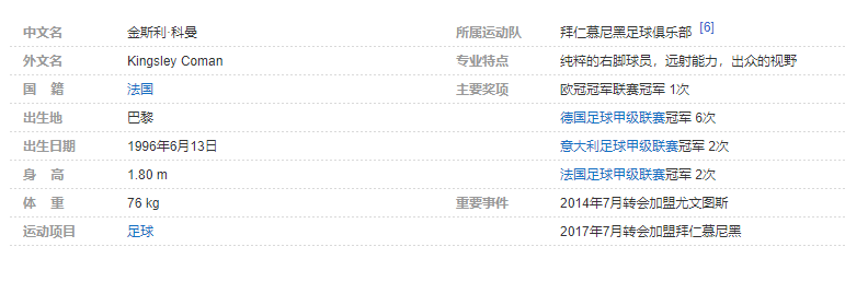 金斯利·科曼(Kingsley Coman),1996年6月13日出生于法国巴黎,法国职业足球运动员,主要司职左边锋,还能客串影子前锋和前腰,效力于德国足球甲级联赛的拜仁慕尼黑足球俱乐部。 个人简介