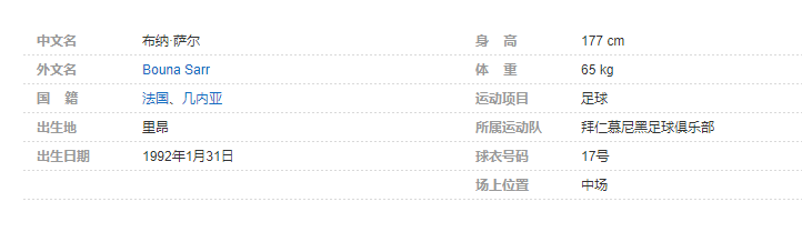布纳·萨尔(Bouna Sarr),1992年1月31日出生于法国里昂,法国足球运动员,场上司职右后卫,现效力于德国足球甲级联赛的拜仁慕尼黑足球俱乐部。个人简介