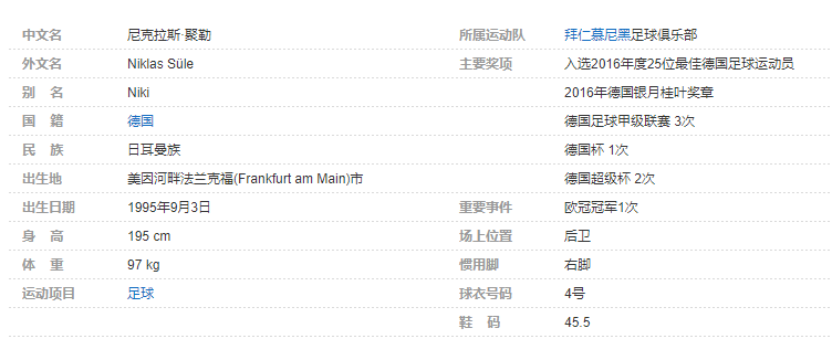 尼克拉斯·聚勒(Niklas Süle),1995年9月3日出生于德国美因河畔法兰克福市, [1] 德国职业足球运动员,场上司职后卫,现效力于拜仁慕尼黑足球俱乐部。个人简介