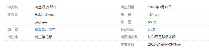 哈基姆·齐耶什(Hakim Ziyech),1993年3月19日出生于荷兰德龙滕,是拥有摩洛哥/荷兰双重国籍的足球运动员。司职中场,现效力于英格兰的切尔西足球俱乐部 。个人简介