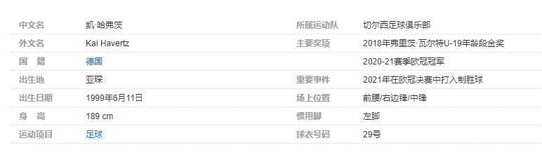 凯·哈弗茨(Kai Havertz),1999年6月11日出生于德国亚琛,德国男子职业足球运动员,司职前腰,亦可胜任右边锋和中锋,现效力于英超的切尔西足球俱乐部。个人简介