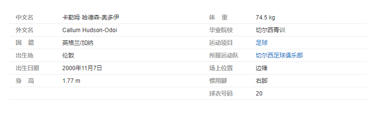 卡勒姆·哈德森-奥多伊(Callum Hudson-Odoi),2000年11月7日出生于英格兰伦敦,英格兰足球运动员,司职边锋,效力于英格兰足球超级联赛的切尔西足球俱乐部。