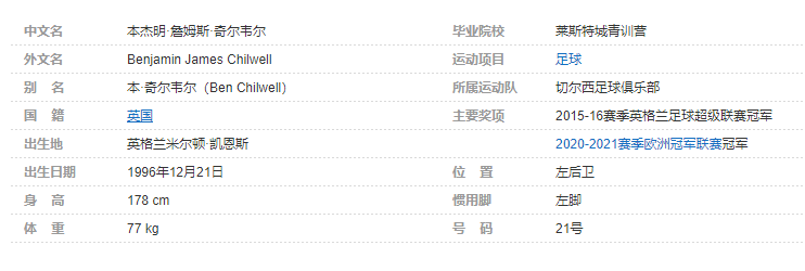 本·奇尔韦尔(Ben Chilwell),全名本杰明·詹姆斯·奇尔韦尔(Benjamin James Chilwell),1996年12月21日出生于英格兰米尔顿·凯恩斯,英格兰足球运动员,司职左后卫,现效力于英格兰足球超级联赛的切尔西足球俱乐部。个人简介