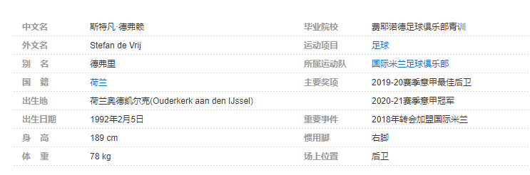 斯特凡·德弗赖(Stefan de Vrij),1992年2月5日出生于荷兰奥德凯尔克市,荷兰足球运动员,司职后卫,现效力于意甲的国际米兰足球俱乐部。个人简介