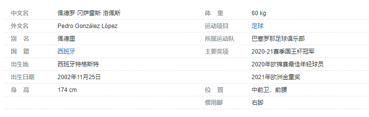 佩德罗·冈萨雷斯·洛佩斯(Pedro González López),昵称佩德里(Pedri),2002年11月25日出生于西班牙特格斯特,西班牙足球运动员,司职中前卫/前腰,现效力于西班牙足球甲级联赛的巴塞罗那足球俱乐部。