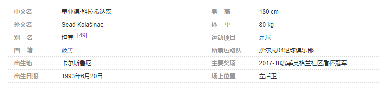 塞亚德·科拉希纳茨(Sead Kolasinac),1993年6月20日出生于德国卡尔斯鲁厄,波斯尼亚和黑塞哥维那籍职业足球运动员,场上司职为左后卫,现效力于德国足球甲级联赛的沙尔克04足球俱乐部 。个人简介