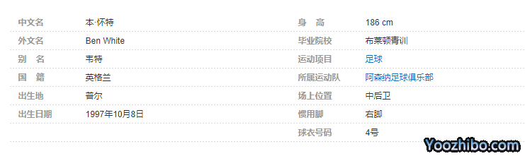 本·怀特(Ben White),全名本杰明·威廉·怀特(Benjamin William White),1997年10月8日出生于英国普尔,英格兰足球运动员,场上司职中后卫,现效力于英超的阿森纳足球俱乐部。个人简介