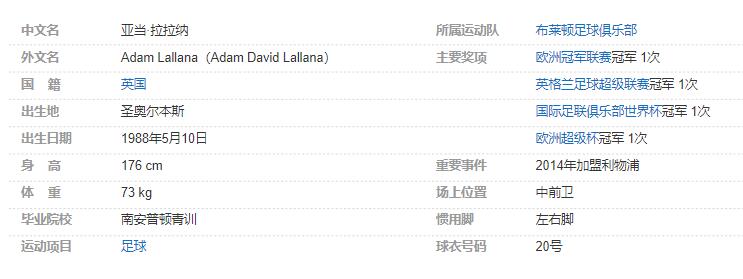亚当·拉拉纳(Adam Lallana),1988年5月10日出生在圣奥尔本斯,英格兰足球运动员,场上司职中前卫,现效力于英超的布莱顿足球俱乐部。个人简介