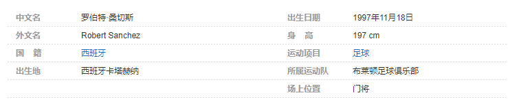 罗伯特·桑切斯(Robert Sanchez),1997年11月18日出生于西班牙卡塔赫纳,西班牙足球运动员,司职门将,现效力于布莱顿足球俱乐部。个人简介