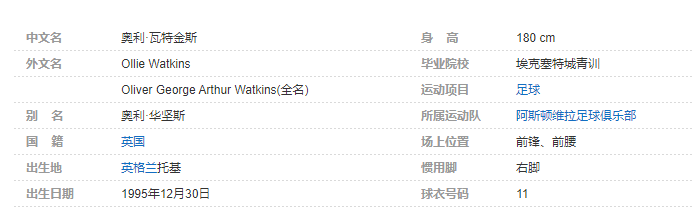奥利·瓦特金斯(Ollie Watkins ),1995年12月30日出生于英格兰托基,英格兰足球运动员,场上司职前锋或前腰,现效力于英格兰足球超级联赛的阿斯顿维拉足球俱乐部。