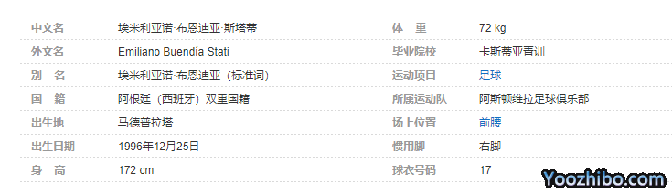 埃米利亚诺·布恩迪亚·斯塔蒂(Emiliano Buendía Stati),1996年12月25日出生于马德普拉塔,阿根廷职业足球运动员,场上司职前腰、边锋,现效力于阿斯顿维拉足球俱乐部。个人简介