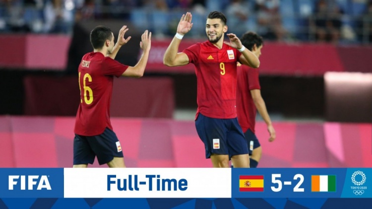 直播车7月31日讯 北京时间7月31日下午16:00,东京奥运会男足第一场1/4决赛,西班牙对阵科特迪瓦。上半场,明格萨伤退,拜利角球破僵,奥尔莫扳平,乌奈-西蒙神扑,奥亚萨瓦尔越位进球。半场结束,西班牙暂1-1科特迪瓦。下半场,阿森西奥中框,格拉德尔小角度破门,拉法-米尔绝平。常规时间90分钟结束,西班牙2-2科特迪瓦进加时。加时赛上半场,拜利禁区内手球奥亚萨瓦尔点射。加时赛下半场,拉法-米尔连入两球戴帽。西班牙5-2淘汰科特迪瓦,四强战将面对日本和新西兰之间的胜者。