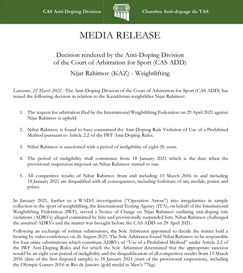 这样的事情并不令人意外,在2021年年初开始,国际举重联合会就在公告中显示,尼德札特-拉希莫夫另一位罗马尼亚运动员在2016年期间因为替换兴奋剂检测尿样,被暂时禁赛。