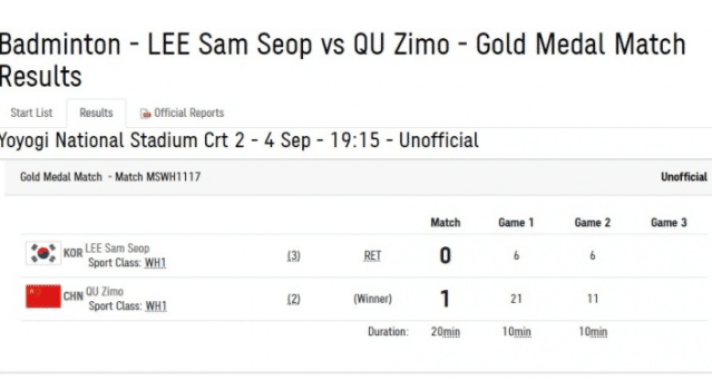 第91金:羽毛球男子单打WH1级,屈子墨夺冠,他决赛的对手是韩国选手李三燮,对手在第二局退赛,首局屈子墨以21-6,第二局对手退赛的时候,屈子墨11-6领先对手,优势还是很大的。