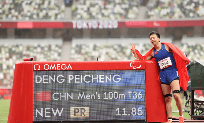 第87金:男子100米T36级,邓培程一骑绝尘,他以11秒85的速度打破了残奥会纪录,如愿夺得冠军。