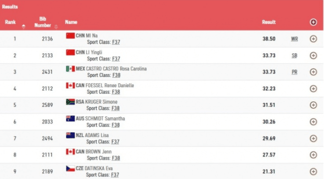 第93金:女子铁饼F38级,中国队选手包揽了金牌和银牌,其中米娜以38.50米破世界纪录的成绩夺金,李英粒斩获银牌。