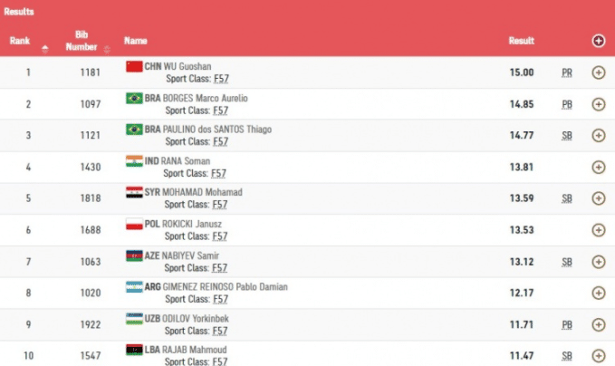 第86金:男子铅球F57级别,此前吴国山以15米00的成绩打破亚洲纪录,本来是银牌的成绩,但因为鲍里诺最好一投被判犯规,所以吴国山递补获得金牌,恭喜。