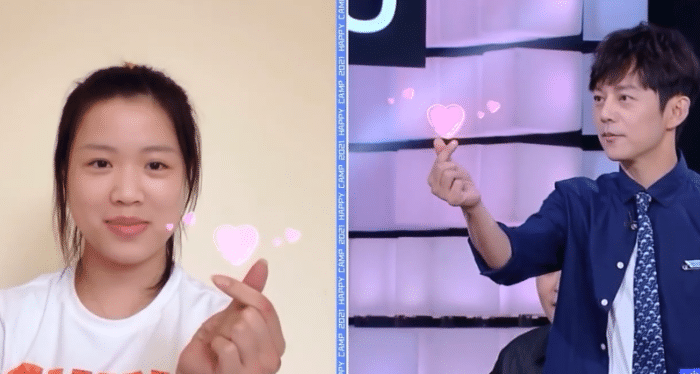 杨倩的标志性动作是比心,首金之后的颁奖典礼上杨倩也做了这个动作,何炅让杨倩选择现场录制节目的人一起比心,杨倩选择了何炅,何炅称这是自己巨大的荣幸。随后两人在音乐的节奏下比心,卡点比心的工夫也是很强。何炅是做娱乐节目的,所以节奏非常好,而奥运会双金王杨倩也是丝毫不落后,也还是各种花式比心,很显然这个动作也是她最喜欢的。