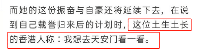 中国香港队核心队员杜凯琹,她在接受采访时表示,“以往,每当国歌响起的时候,我都会在场下一起唱,而在这次奥运会中,当国歌奏响的时候,站在季军位置上的我,也得到了唱国歌的机会。看到国旗和区旗一同在赛场上升起时,我感到非常振奋和自豪”。