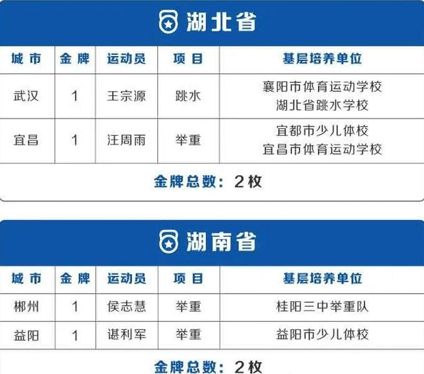江苏代表是张雨霏的2枚金牌;两湖都是拿下2金,湖北的王宗源跳水夺冠,汪周雨举重实力夺冠。湖南是侯志慧和谌利军,其中侯志慧无悬念夺冠,谌利军逆袭摘金。