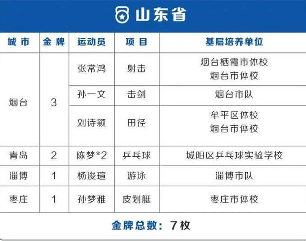 山东7金中烟台3金,张常鸿的射击、孙一文的击剑压哨绝杀、刘诗颖标枪夺魁;陈梦在乒乓球女单和女团斩获2金、杨浚瑄游泳接力夺冠、孙梦雅拿下皮划艇金牌。
