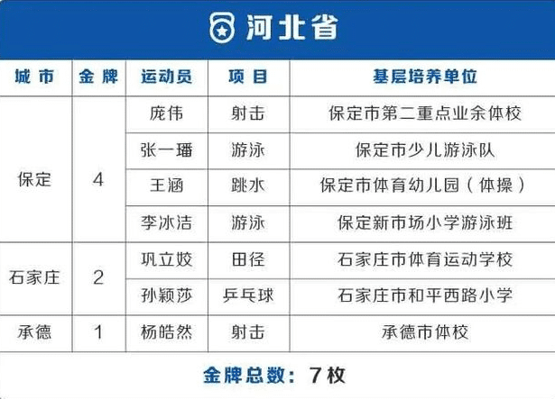 河北一共7金,其中保定4金,有射击的庞伟、游泳的张一璠、跳水的王涵和游泳的李冰洁;巩立姣和孙颖莎都是来自石家庄,杨皓然是承德人,他和杨倩一起拿下射击的金牌。