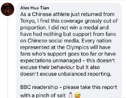 华天写道:“作为一名刚刚结束东京奥运会比赛的运动员,我发现BBC的这篇文章完全不符合事实,我没有拿到奖牌,但是依然得到了国内粉丝的支持。每一个参赛的国家都会有极端和失控的球迷,这一点无法反驳,但是这不能成为不实报道的借口。BBC的读者们请对这篇报道的真实性持保留态度。”有了中国参赛运动员的亲身回应,BBC的这段谣言应该会不攻自破,但是他们抹黑的脚步应该不会停止。
