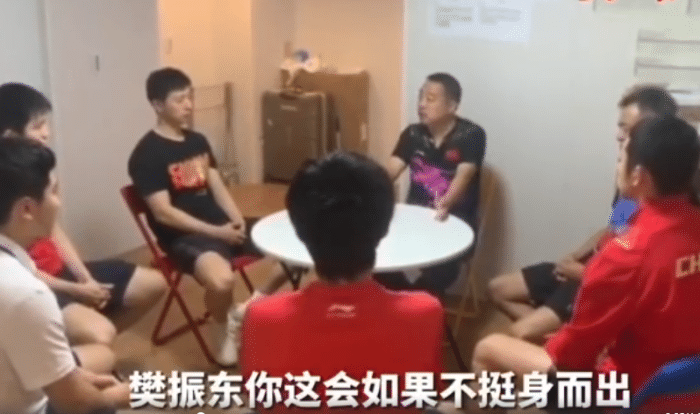 奥运会乒乓球收官之战是男团的决赛,马龙、许昕和樊振东顶住了压力,成功拿下奥运会金牌。这场比赛赛前刘国梁在更衣室内给球员们鼓励和进行动员大会,表示这是历史的使命,也是巨大的荣誉。同时刘国梁还点评樊振东,一定要站出来,尤其是在身边有世界上最好的搭档马龙和许昕的情况下,就更要站出来了。刘国梁还连续使用排比句来激励樊振东:“你的内心是不是足够强大?是不是配得上你的球,配得上你的人,配得上你的位置,配得上大家的期待和期望。”