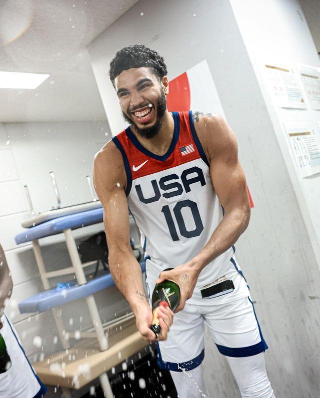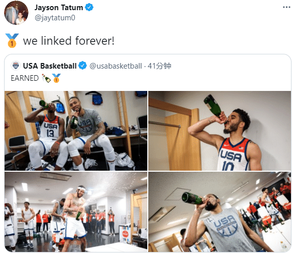 美国男篮官方晒出全队疯狂庆祝的画面,更衣室瞬间变成他们的狂欢派对,麦基赤膊喷洒香槟,塔图姆和凯尔登-约翰逊也尽情享受胜利的喜悦;塔图姆转发狂欢照,发推:我们永远联系在一起。
