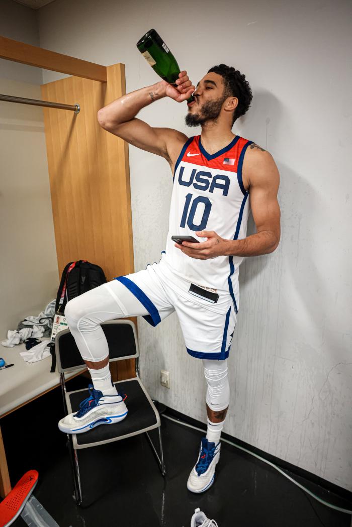来源:直播车08-07 19:19直播车讯 北京时间8月7日,美国男篮87-82战胜法国夺得东京奥运金牌,从而实现奥运四连冠的伟业,杜兰特则是收获个人第三枚金牌;赛后回到更衣室,美国男篮全队狂喷香槟庆祝,杜兰特、利拉德和阿德巴约等球员都是直接对瓶吹,狂饮香槟太嗨了。