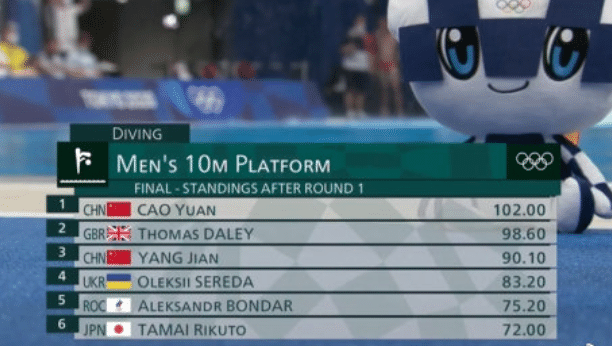第一轮,戴利动作是307C,难度3.4,得到98.60分,杨健是和戴利一样的动作,只有90.10分;曹缘第一跳三个有效分10分,得到102.00分。