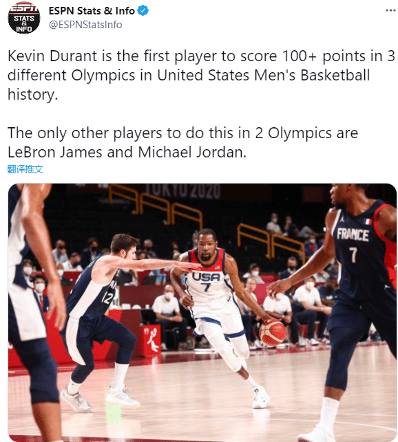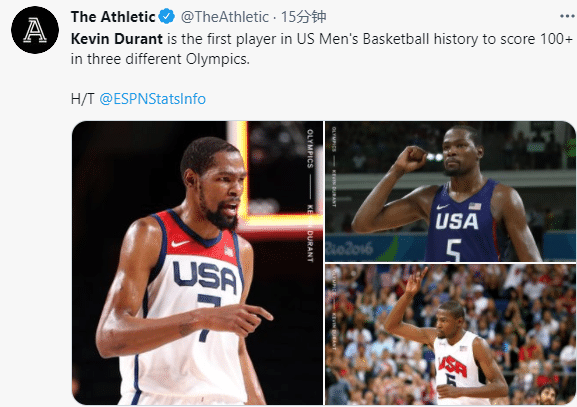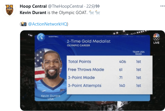 杜兰特多项神迹成为美国队史奥运第一人,美媒Hoop Central发推盛赞杜兰特是奥运会历史最佳(GOAT);美媒TA也晒出杜兰特的神迹。