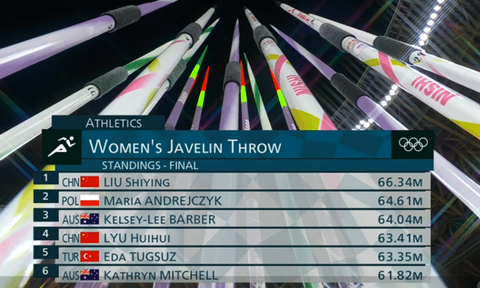 中国两名选手都进了最后3投,土耳其选手62.17,吕会会第四投61.85,澳大利亚选手第四投64.04,波兰选手安德烈济科第四投63.62,刘诗颖第四投犯规,吕会会第5投59.54,也许是受体力影响,她比前几投差了很多,刘诗颖第五投直接弃投了,从场上情况来看,刘诗颖似乎是受伤了,她走向场边的时候腿部有些不适,最后一投吕会会的成绩依旧是没有过60米,波兰选手也没有过60分,最终刘诗颖凭借第二投锁定金牌。在金牌榜上,中国36金第一,美国31金第二。