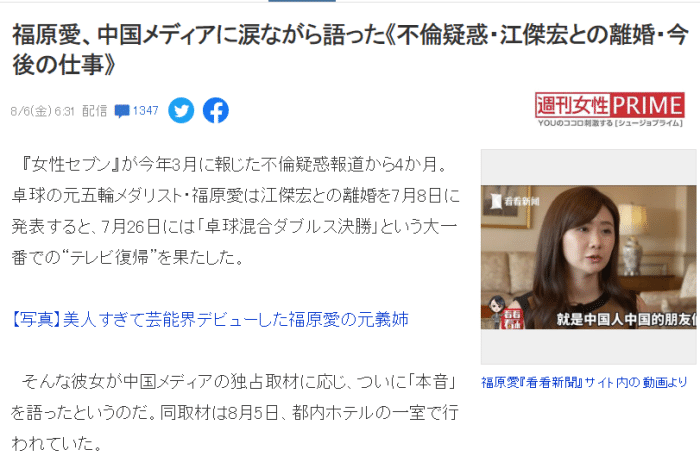 来源:直播车08-06 11:51直播车讯 北京时间8月6日消息,日前中国媒体在日本对福原爱进行专访。在访谈中,福原爱表示感谢中国朋友对她的支持和爱,并说了一句很重的话,“我能活到今天,是因为中国人的支持”。日媒随后报道了福原爱的专访,不过却引发日本网友的痛批!