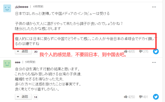 不过,福原爱的这些言论,还是遭到了部分日本网友的批评。有日本网友表示:“我个人的感觉是,不要回日本,到中国去吧”,“我不明白他为什么会带着被害者的意识来回答采访。明明是自己种下的种子,却像事不关己似的痛哭流涕,这是不应该的。不要忘记,最痛苦的不是你,而是江一家。”