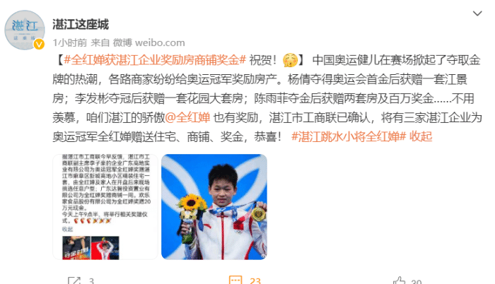来源:直播车08-06 11:50直播车讯 北京时间8月6日消息,在东京奥运会斩获女子单人10米跳台金牌的14岁选手全红婵,获得了广东湛江当地三家企业的奖励。三家企业分别奖励全红婵一套房子,一间商铺和20万奖金。